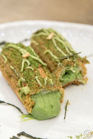 抹茶冰淇淋泡芙,柔軟的泡芙皮搭配以一保堂抹茶製成的抹茶冰淇淋,再灑上少許抹茶粉增色、增香,入口微冰的口感讓泡芙皮多了一微抗的輕咬勁,滿口抹茶香的滋味,讓人恨不得這泡芙有多上兩到三倍的巨大。