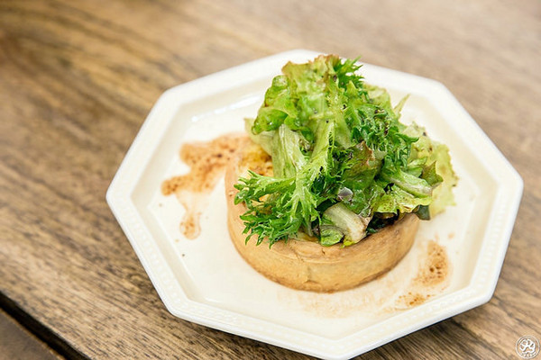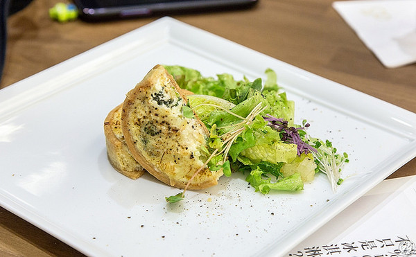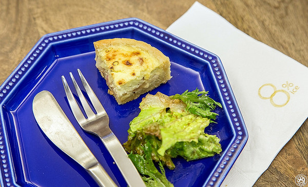 入口時那份淡淡的胡椒香和餅皮烤過的微焦香先聲奪人的竄了出來,以兩段式烤法的鹹派(皮烤一次入餡後再烤一次)吃來酥的極有層次,派餡方面蛋香很是濃厚卻不至生膩、洋蔥甜和培根鹹香、蛋、奶油混合的油甜香,熱呼呼的纏上舌尖極為過癮,簡直是好吃的亂七八糟,我超愛的。